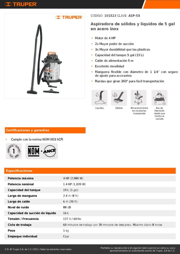 Ficha tecnica Aspiradora Industrial Truper 19 litros Aspiradora industrial con cubierta en acero inoxidable para uso en zonas comerciales, industriales y residenciales. Con ruedas giratorias a 360° para fácil movimiento.