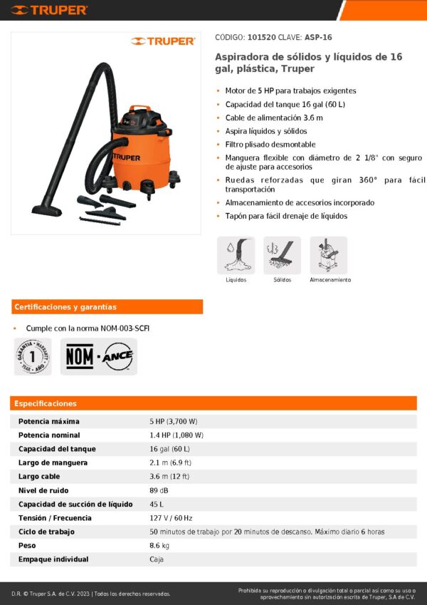 Ficha Técnica Aspiradora Truper 101520 Aspiradora para uso en zonas comerciales, industriales y residenciales. Con ruedas giratorias a 360° para fácil movimiento.