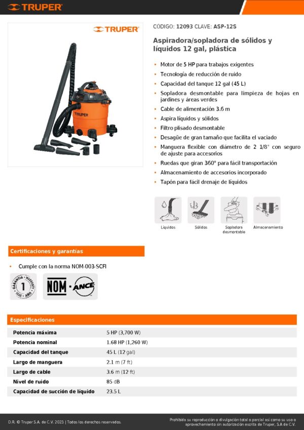 Ficha Tecnica Aspiradora Sopladora Truper 12093 Aspiradora para uso en zonas comerciales, industriales y residenciales. Con ruedas giratorias a 360° para fácil movimiento.