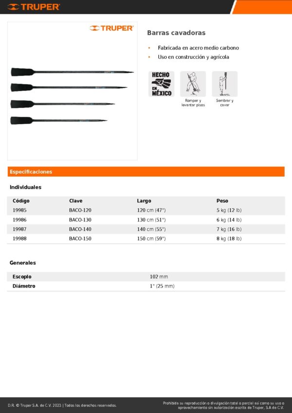 Ficha técnica barras Truper Barra en hierro para trabajos en el agro y la construcción. Presenta un largo de 140 centímetros y peso de 16 libras.