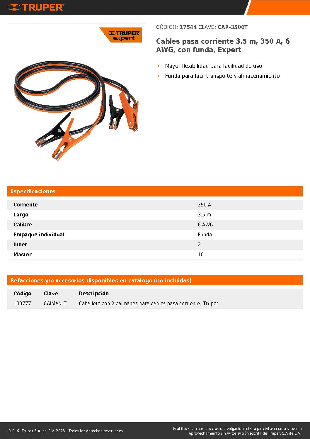 Cable para dar inicio a baterías de 6 AWG para mejor transmisión y con gran flexibilidad. Tiene 3.5 mts de largo e incluye funda. Corriente 350 amperios.