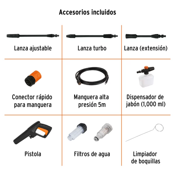Hidrolavadora 1800 PSI para lavados con resultados superiores, con sistema de paro automático y sistema de conexión rápida para manguera.