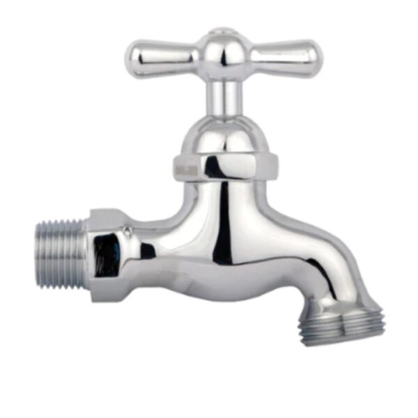 Llave metálica pesada para jardin, lavadero o lavatraperos con terminal roscada para conexión de manguera.