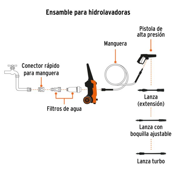 Hidrolavadora eléctrica 1500 PSI de alta presión, para buenos resultados en medianas a altas exigencias. Además, cuenta con un kit de accesorios especiales con doble filtro y dispensador de jabón.